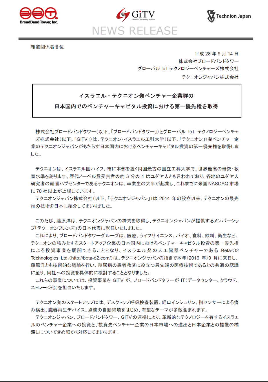 またTechnion Japanは同じく、 global IOT tehcnology venturers 株式会社と業務提携し、下記の通りの記者発表を行いました。